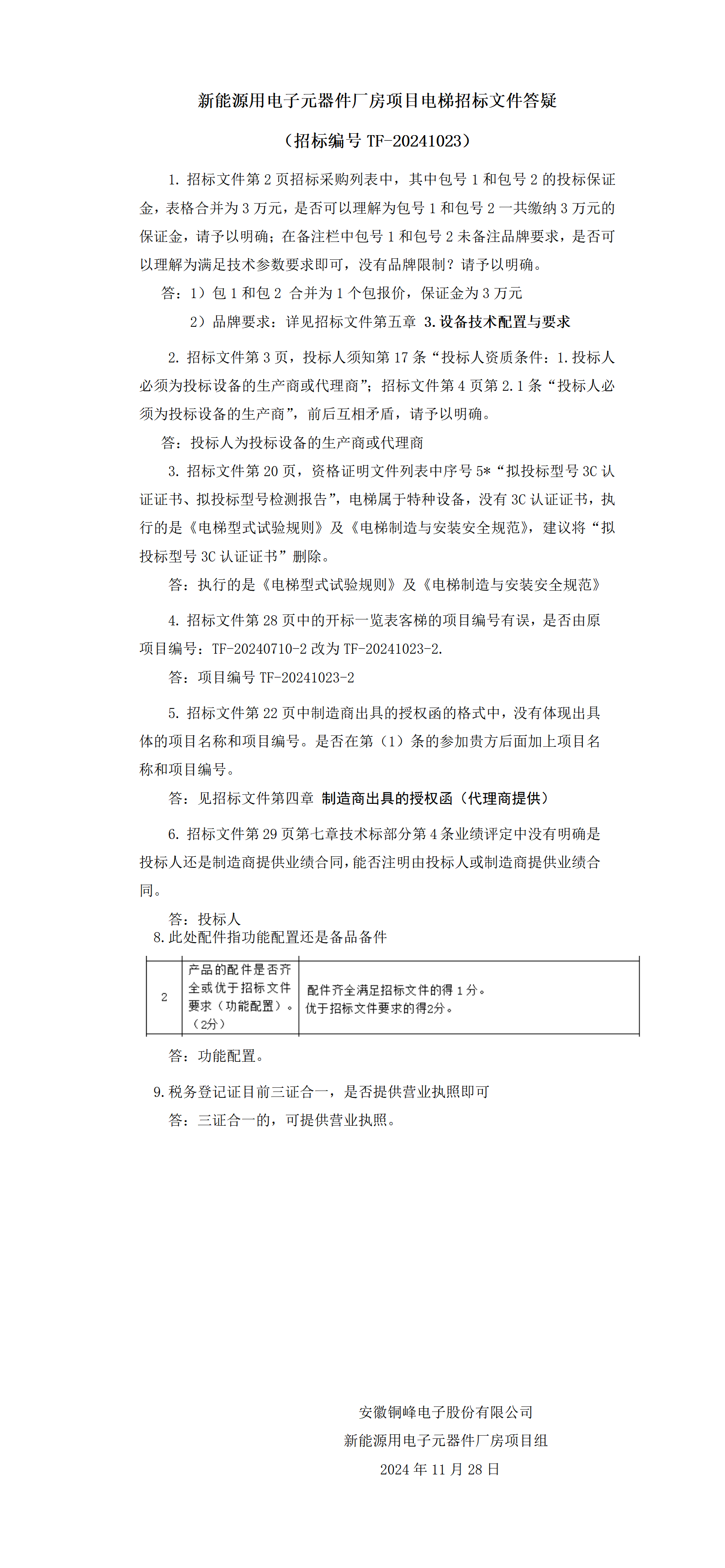 新能源用電子元器件廠房項(xiàng)目電梯招標(biāo)文件答疑(招標(biāo)編號TF-20241023)