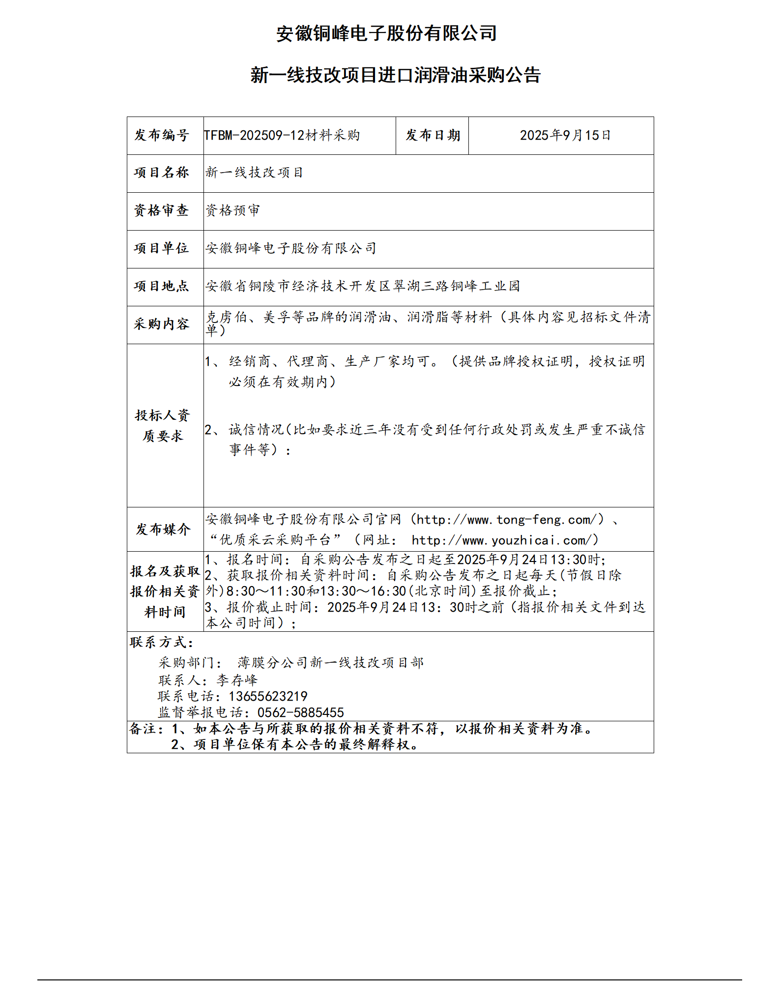 安徽銅峰電子股份有限公司 (新一線技改項目進口潤滑油采購公告)_01